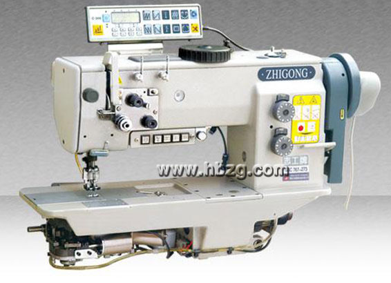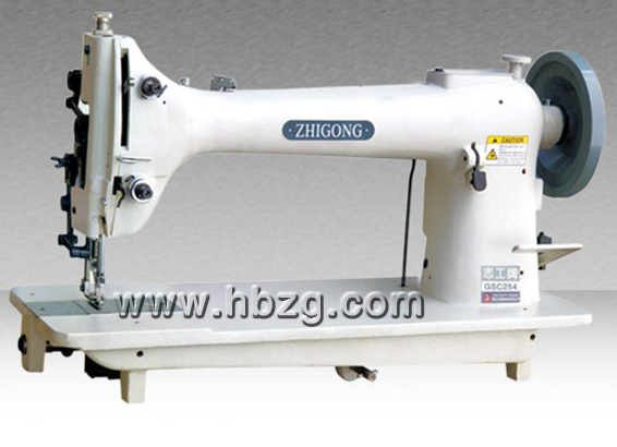 采用大型立式旋梭勾線、滑桿挑線;分為單針、雙針兩種機型,上下軸用軸承支承,同步齒形帶傳動,三同步綜合送料:機針、送布牙和壓腳交叉升降機構(gòu),保證在額定范圍內(nèi)的任何長度針距下、縫紉滑性、粘性縫料及特長制品時上下層不位移、使縫制品整齊、線跡美觀。